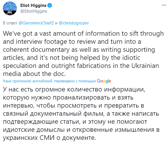 Например, Христо Грозев просто банит в Твиттере пользователей, которые задают вопросы о фильме по "вагнеровцам". А основатель Bellingcat Элиот Хиггинс назвал публикации украинских СМИ, ожидающих долгожданного выпуска, "идиотскими спекуляциями".