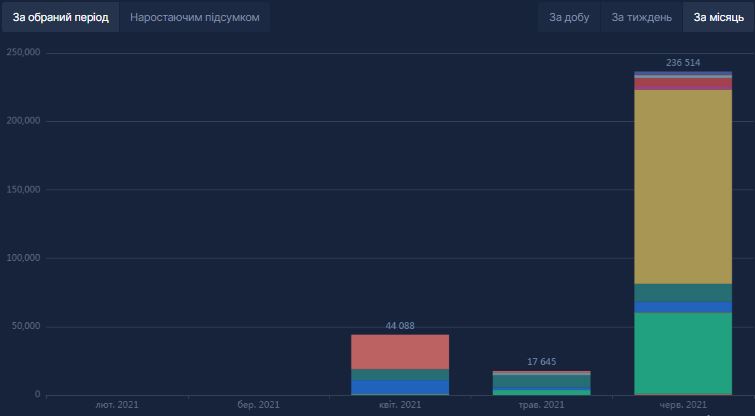 В пунктах вакцинации в регионах украинцев, которые входят в категории, попадающие под вакцинацию, до июня чаще всего кололи "АстраЗенекой" индийского и южнокорейского производства. Пик пришелся на апрель.