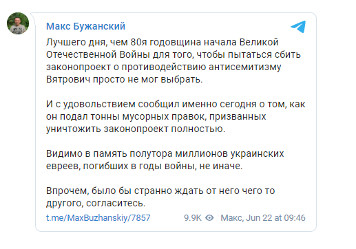 "Лучшего дня, чем 80я годовщина начала Великой Отечественной Войны для того, чтобы пытаться сбить законопроект о противодействию антисемитизму Вятрович просто не мог выбрать.