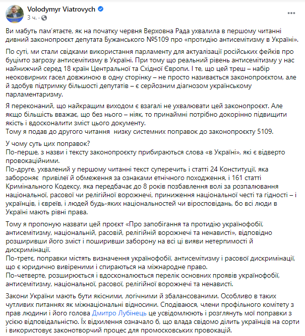 "При том что реальный уровень антисемитизма у нас самый низкий среди 18 стран Центральной и Восточной Европы. И то, что этот трэш - набор неуклюжих лозунгов длиной в одну страницу - не просто называется законопроектом, но и получил поддержку большинства депутатов - является серьезным диагнозом украинскому парламентаризму", - считает Вятрович.