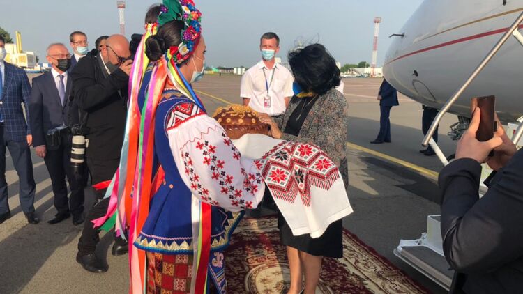 На фотографиях с прибытия президента видно, что Саломе Зурабишвили встретили молодые люди в традиционной украинской одежде, ей поднесли каравай на рушнике и подарили букет цветов.