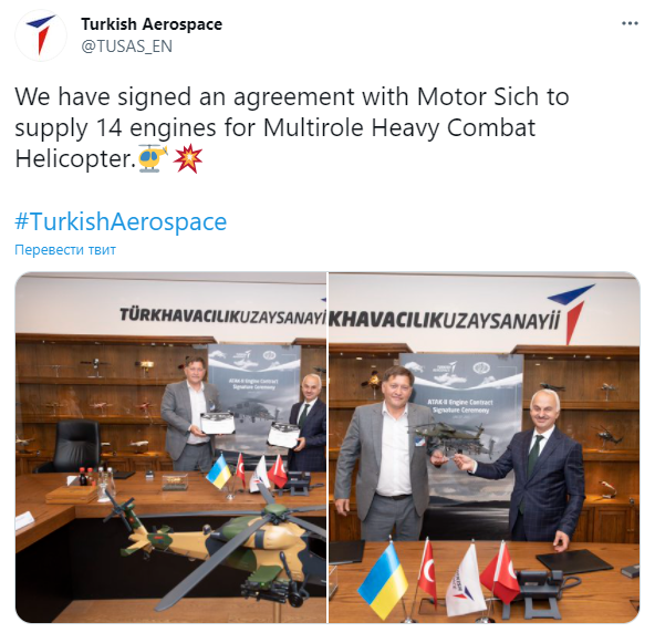 Турецкая оборонная компания Turkish Aerospace Industries подписала контракт с "Мотор Сич" на поставку 14 вертолетных двигателей. Соглашение заключено во вторник, 29 июня, сообщается на официальной странице турецкого предприятия в Twitter.