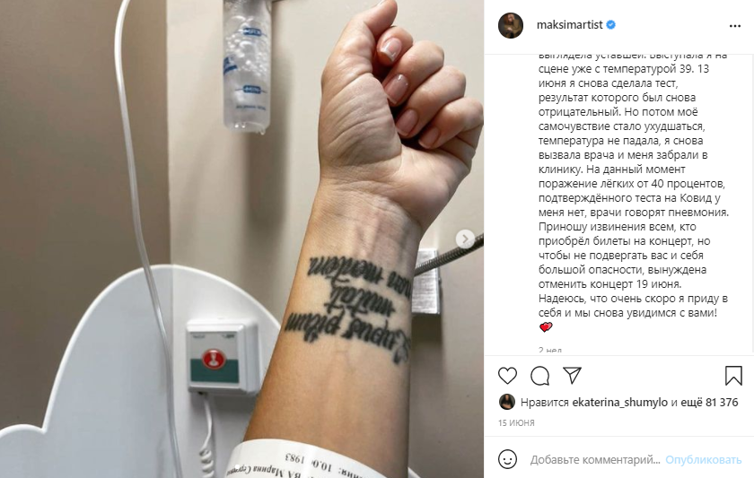 В своем последнем посте от 15 июня певица призналась, что на сцене выступала с температурой 39. И снова сделала ковид-тест, который был отрицательным. Самочувствие только ухудшалась, а температура не падала. Врачи, которые забрали артистку в клинику, выявили пневмонию с 40% поражением легких.