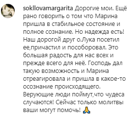 "Дорогие мои. Ещё рано говорить о том, что Марина пришла в стабильное состояние и полное сознание. Но надежда есть! Наш дорогой друг о. Лука посетил ее, причастил и пособоровал. Это большая радость для нас всех и прежде всего для неё. Господь дал такую возможность, и Марина отреагировала и пришла в какое-то осознание происходящего именно в эти минуты. Верующие люди поймут, что чудеса случаются! Сейчас только молитвы ваши могут помочь!" - написала директор МакSим.