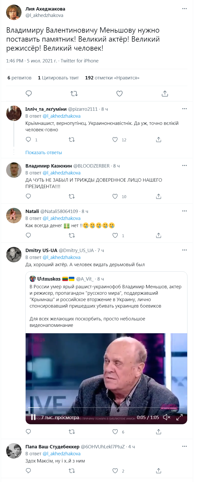 Как, например, твит коллеги Меньшова Лии Ахеджаковой, которая часто критикует российскую власть за политику в отношении Украины. Ее захейтили украиноязычные пользователи.