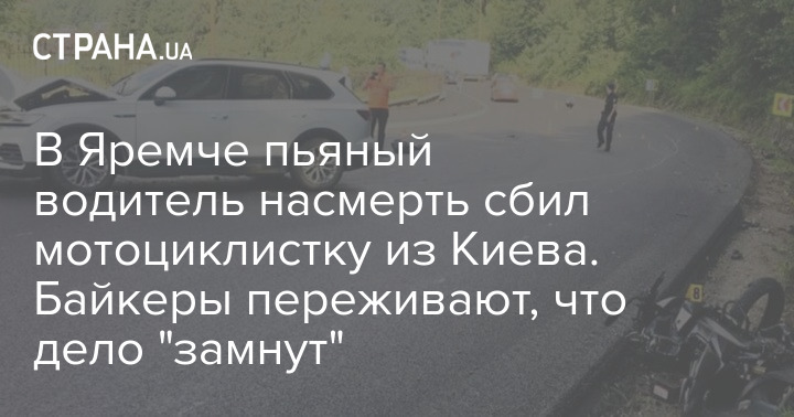 В городе Яремче Ивано-Франковской области пьяный 25-летний парень за рулем Volkswagen Touareg выехал на встречную полосу и сбил 32-летнюю жительницу Киева, которая ехала на мотоцикле. В результате женщина скончалась. Представители байкерского сообщества опасаются, что дело "замнут".