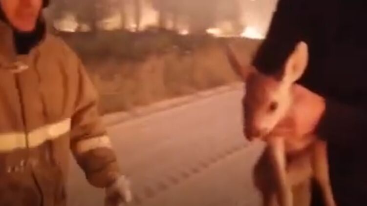 На одном из видео и с места событий запечатлено, как пожарные вынесли из горящего леса маленького олененка, который жалобно плачет.