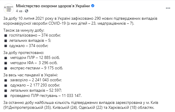 По состоянию на утро воскресенья, 11 июля, общее количество зараженных коронавирусом в Украине с начала эпидемии выросло еще на 290 человек.
