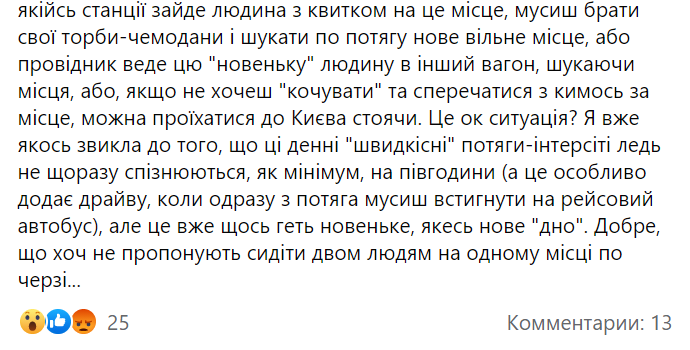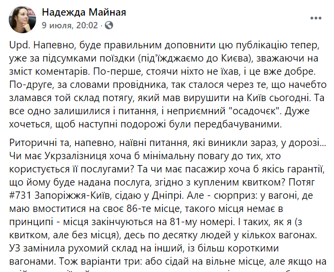 Это произошло из-за того, что состав заменили, не сказав об этом тем, кто купил билеты, рассказала в Facebook пользователь Надежда Майная.