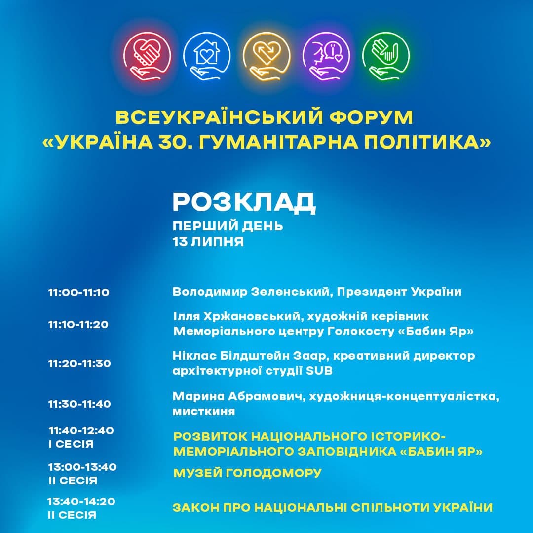 "Форум откроет президент Владимир Зеленский. В течение сессий спикеры будут говорить о Национальном историко-мемориальном заповеднике "Бабий Яр", Музее Голодомора, законах о национальных сообществах и о коренных народах. А также - о развитии государственного языка и использование его в публичном пространстве", - говорится в сообщении.