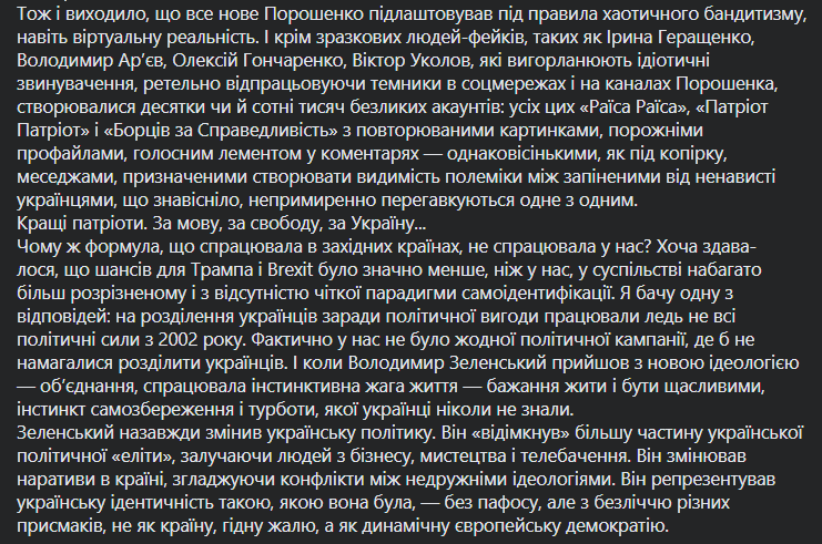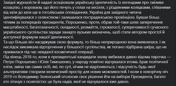 "Петр Порошенко пытался искусственно насадить консервативные идеалы начала ХХ века, которые потеряли свою актуальность и для многих уже не казались привлекательными. Он потратил уйму усилий на построение формулы идентичности со слишком хрупкими компонентами: армией, на которой наживалось его окружения, языке, которым не общались в его семье, вере, которую он отождествлял с автокефалии Украинской Церкви и которую превратил в попсовый электоральный тур с Томосом", - пишет Мендель.