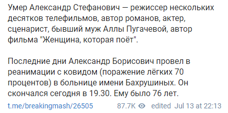 "Он скончался сегодня в 19:30. Ему было 76 лет", - сообщили в Telegram.