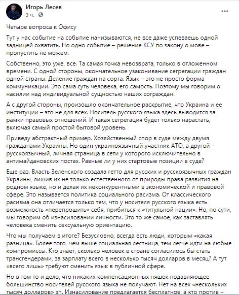 Публицист Игорь Лесев написал, что речь идет о дискриминации и "изнасиловании личности", ведь носитель русского языка в Украине выводится за рамки правовых отношений.