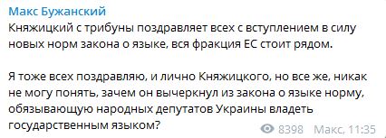 Нардеп от "Слуги народа" Максим Бужанский обратил внимание, как в Раде радовались вступлению в силу новых норм те же парламентарии, которые вычеркнули норму об обязательном владении украинским языком для депутатов".