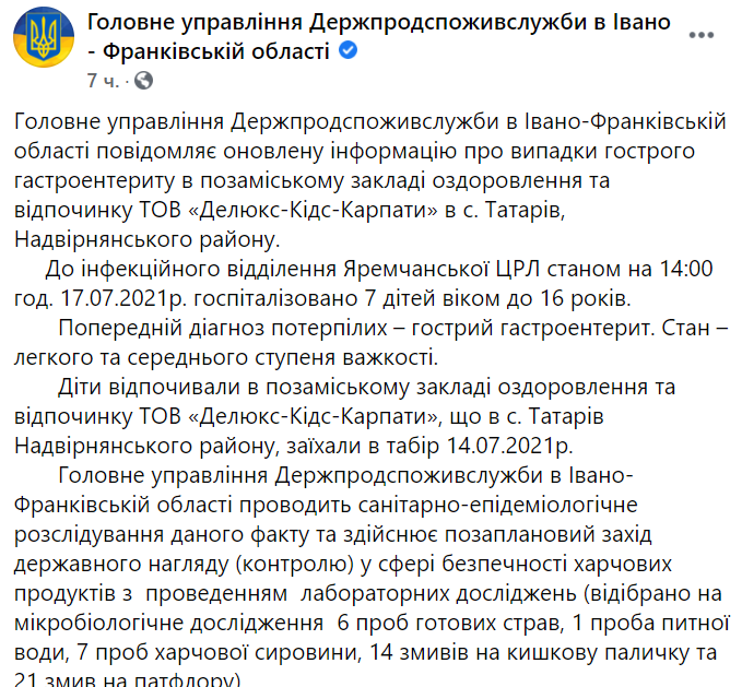 "В инфекционное отделение Яремчанской ЦРБ по состоянию на 14:00 17 июля госпитализированы 7 детей в возрасте до 16 лет. Диагноз пострадавших - острый гастроэнтерит. Состояние легкое и средней степени тяжести. Дети отдыхали в загородном учреждении оздоровления и отдыха ООО "Делюкс-Кидс-Карпаты", что в с. Татар Надвирнянского района, заехали в лагерь 14 июля", - сообщили в облуправлении.