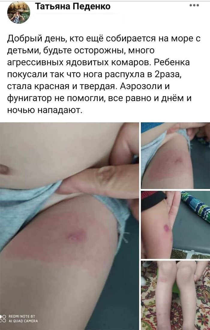 "Кто ещё собирается на море с детьми, будьте осторожны, много агрессивных ядовитых комаров. Ребенка покусали так, что нога распухла в два раза, стала красная и твердая. Аэрозоли и фумигатор не помогли, все равно и днём и ночью нападают", - писала Татьяна. Женщина отмечает, что им пришлось вызывать "скорую помощь" для ребенка. Медики сделали укол чтобы снять воспаление.
