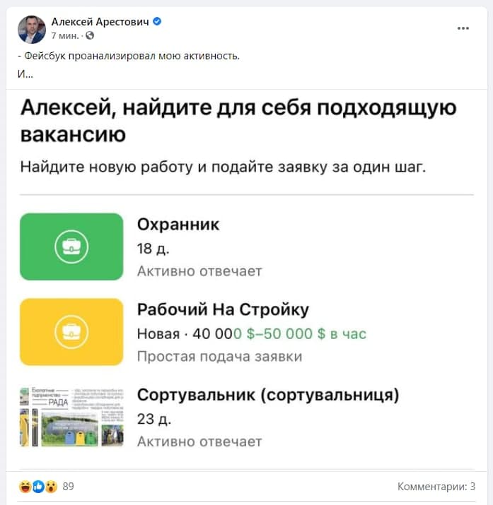 Арестович признался, что Фейсбук предлагает ему работу сортировщика и охранника