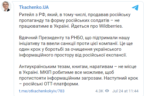 "Ритейл из РФ, который, в том числе, продавал российскую пропаганду и форму российских солдат - не будет работать в Украине. Речь идет о Wildberries.