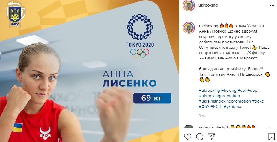 Украинка Анна Лысенко успешно стартовала на Олимпийских играх в Токио на женском турнире по боксу в категории до 69 килограмм. Она победила Умаиму Белахбиб из Марокко и выиграла все пять раундов со счетом 10:9. Это первая победа на Олимпиаде в женском турнире по боксу в истории независимой Украины.