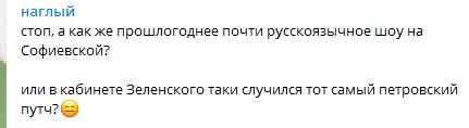 "Стоп, а как же прошлогоднее почти русскоязычное шоу на Софиевской? Или в кабинете Зеленского таки случился тот самый петровский путч?" - напомнил телеведущий Макс Назаров.