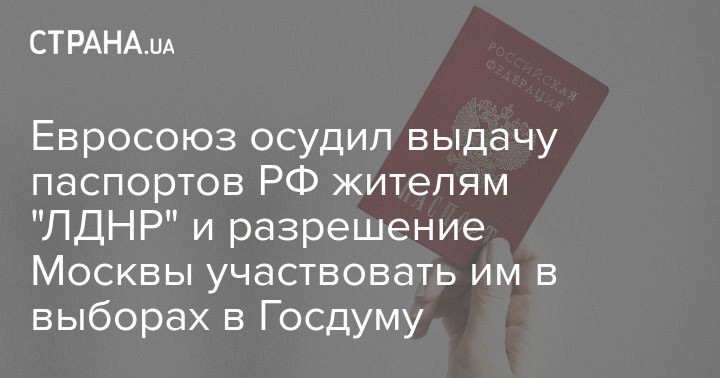 Европейский союз выступил с осуждением массовой выдачи российских паспортов жителям неподконтрольных Киеву территорий Украины. Также в сообществе выразили обеспокоенность разрешением жителям "ЛДНР" голосовать на выборах в российскую Госдуму.