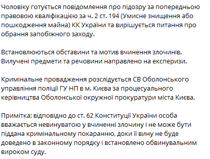 Мужчина находится в Оболонском РОВД ГСЧС в столице. Ему готовятся сообщить о подозрении на основании предварительной юридической квалификации по ч. 2 ст. 194 (умышленное уничтожение или повреждение имущества) УК Украины, также решается вопрос об избрании злоумышленнику меры пресечения.