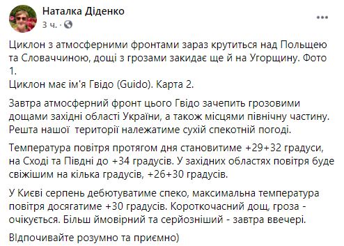 В первые дни месяца жара не сдаст позиции. 1 августа западные и частично северные области зацепит циклон Гвидо, который принесет дожди. После обеда гроза может пройти в Киеве и к вечеру усилиться. Воздух прогреется до +26...+30.