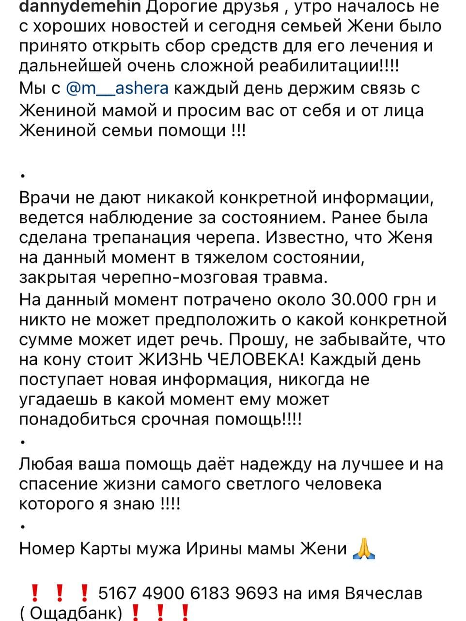 Автор опубликованного в соцсети сообщения заявил, что медики пока не делают никаких прогнозов относительно состояние пострадавшего парня. Семья Евгения Гончаренко уже потратила на его лечение около 30 тысяч гривен, но сколько еще понадобится денег - не известно.
