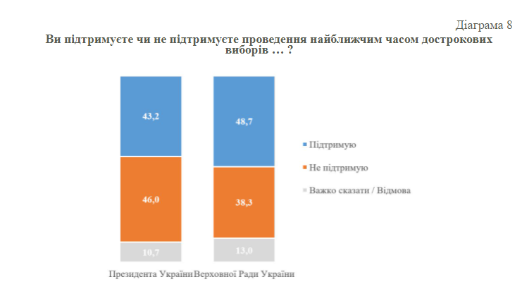 При этом досрочные парламентские выборы поддерживают 48,7% украинцев против 38,3% тех, кто не поддерживает.