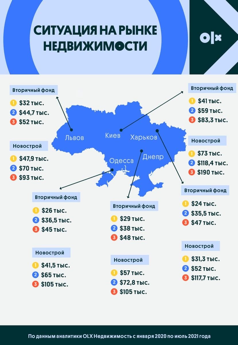 На вторичном рынке жилья в Киеве цены поднялись на 19%, в Днепре - на 30%, в Одессе - на 3,6%, Харькове - на 21%, во Львове - на 8%.