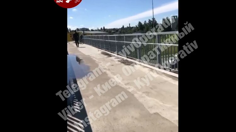 На кадрах с места событий видно девушку, которая сидит на мосту, а возле нее стоит парень с велосипедом. К ней подходит еще один мужчина и валит ее асфальт. Это и был мотоциклист, который рассказал, что увидел ее, когда проезжал мимо.