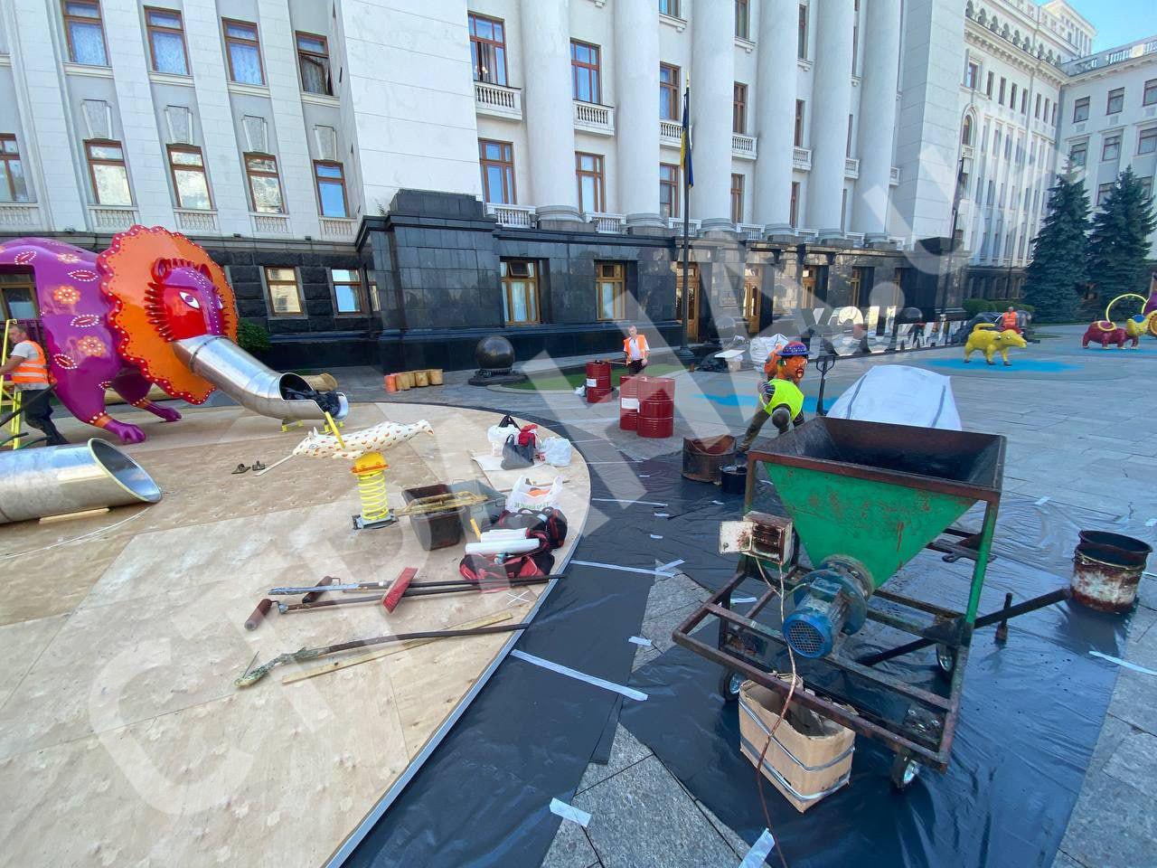 Перед Офисом президента сегодня закончили монтаж игровой площадки с каруселями и качелями. Арт-локацию, созданную по мотивам полотен украинской художницы Марии Примаченко, откроют ко Дню независимости. Она будет бесплатной для всех посетителей.