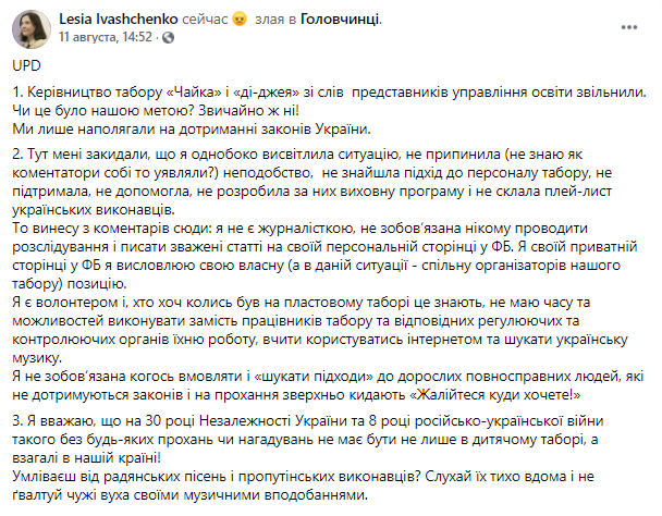 Также в своей публикации девушка сообщила, что диджеи на дискотеках включали детям Басту, Моргенштерна и других исполнителей, многие из которых "считаются персонами нон грата в Украине". Также с территории лагеря звучала песня "Катюша".