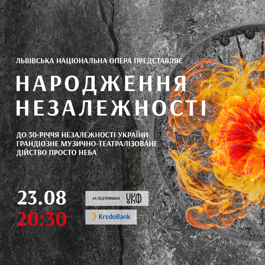 20:00 - концерт "Рождение Независимости" - это концерт-действо, которое состоится накануне Дня Независимости на площади перед Львовской национальной оперой. Зрители смогут насладиться классической музыкой, световым и огненным шоу, уличным театром (пр. Свободы, 28).