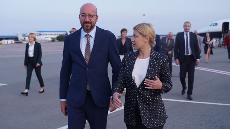 Вице-премьер встретила Шарля Мишеля в аэропорту. Планируется, что в Украине президент Евросовета примет участие в саммите "Крымской платформы", а также других торжественных мероприятиях в честь тридцатилетия независимости страны.