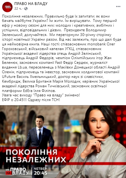 "Первый эфир в новом сезоне для них: молодых и креативных, амбициозных и успешных, ответственных и эффективных. Президент Владимир Зеленский, присоединяйтесь", - говорится в сообщении.