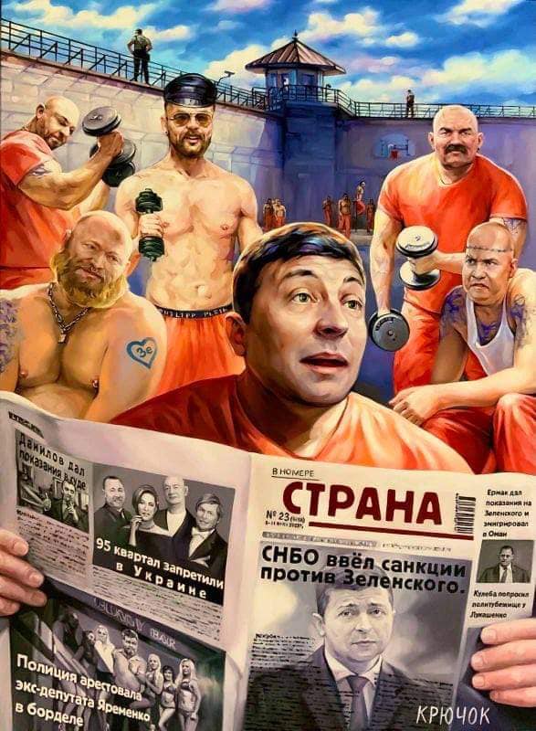 В воскресенье, 29 августа, заместитель главного редактора "Страны" Светлана Крюкова выставила на аукцион картину под названием "Бумеранг", на которой изображен президент Зеленский, находящийся в тюрьме и читающий газету "Страна".