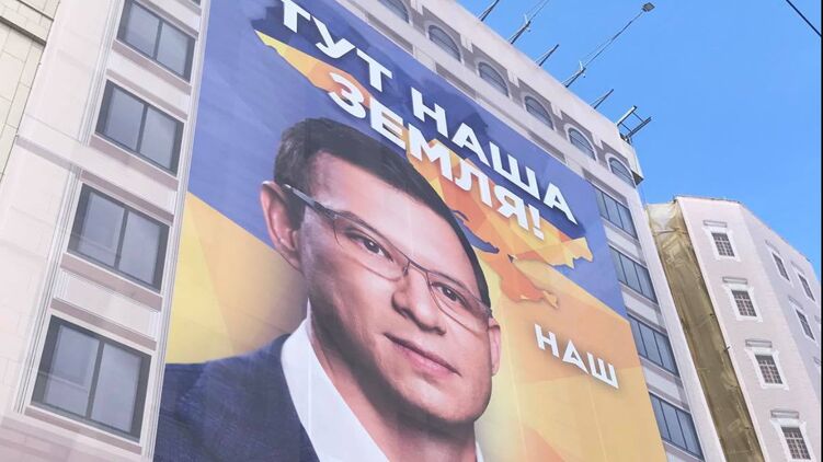 Судя по опубликованной фотографии, на баннере изображен Мураев на фоне карты Украины с подписью "Здесь наша земля". Рядом расположен логотип телеканала "Наш".