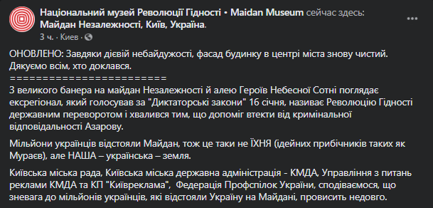 Позже "Национальный музей Революции Достоинства" обновил публикацию, отметив, что баннера больше нет.