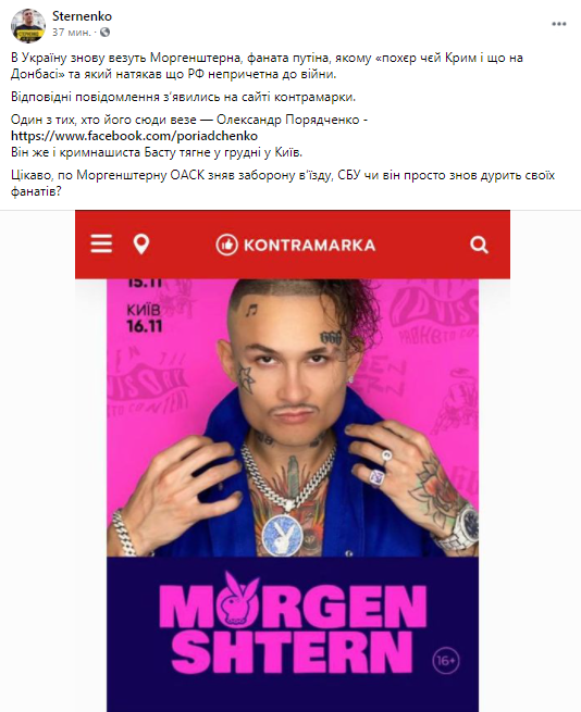 "В Украину снова везут Моргенштерна, фаната Путина, которому "пох@р чей Крым и что там на Донбассе" и который намекал что РФ непричастна к войне", - написал Стерненко на своей странице в соцсети.