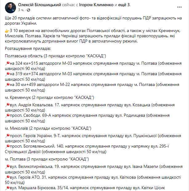 На дорогах Украины заработают еще 20 приборов системы автоматической фото- и видеофиксации нарушений правил дорожного движения. Как сообщил первый заместитель начальника Департамента патрульной полиции Алексей Белошицкий, с 10 сентября на автомобильных дорогах Полтавской области, а также в городах Кременчуг, Николаев, Полтава, Харьков и Черновцы заработают приборы фиксации правонарушений, которые будут контролировать соблюдение требований ПДД в автоматическом режиме.