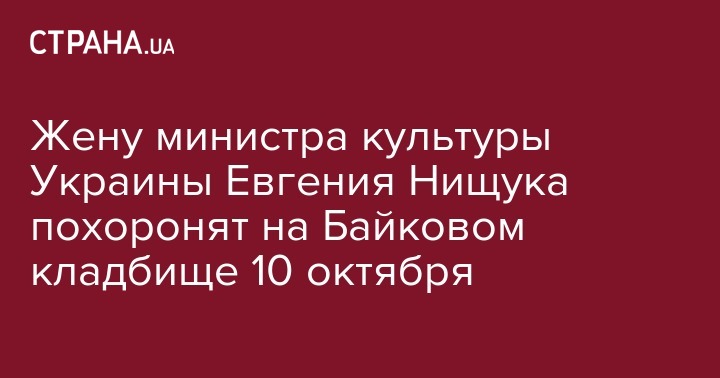 Министр культуры Евгений Нищук рассказал, что его жену, актрису Национального академического драматического театра имени Ивана Франко Оксану Батько-Нищук, похоронят на Байковом кладбище в Киеве. Об этом он написал на своей странице в Facebook.
