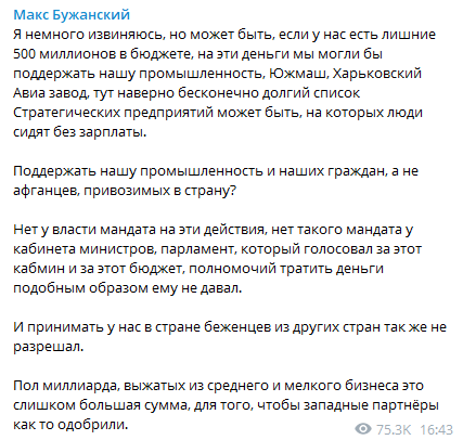 Народный депутат Максим Бужанский предложил направить озвученные властями полмиллиарда на развитие украинской промышленности и поддержку украинцев, а не афганцев.