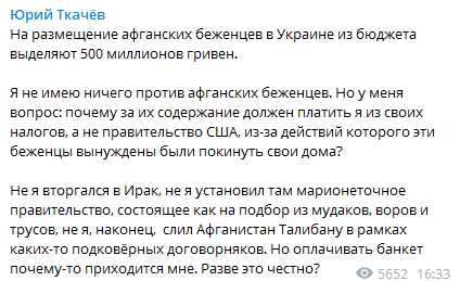 Журналист Юрий Ткачев пишет, что не имеет ничего против поддержки афганских беженцев, но против того, чтобы платить за их содержание из своих налогов.