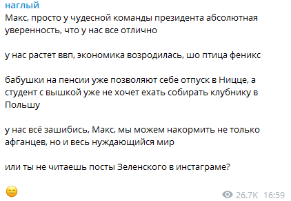 У нас всё зашибись, Макс, мы можем накормить не только афганцев, но и весь нуждающийся мир. Или ты не читаешь посты Зеленского в инстаграме?" - иронизирует Макс Назаров в своем телеграмм-канале "Наглый".