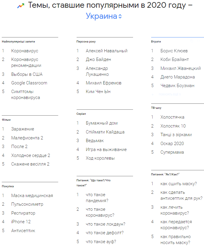 И это мы говорим о молодых людях, которые активно пользуются соцсетями - а не старшем поколении. Как видно из топовых украинских запросов Google за прошлый год, картина для украинизаторов и в перспективе - латинизаторов складывается удручающая.