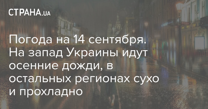 По словам Диденко, лить 14 сентября будет в основном на западе Украины. Может увеличиться облачность и немного увлажниться воздух на севере, в центральных областях, местами в Харьковской области.