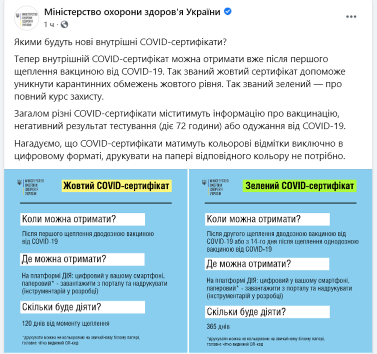 Министерство охраны здоровья Украины сообщило о введении желтых и зеленых Covid-сертификатов. Источник: Facebook