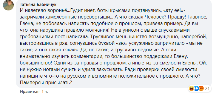 Но было и несколько комментариев в поддержку Фиданян. Люди пишут, что она сказала правду и не побоялась высказать мнение, которое сегодня фактически запрещено.