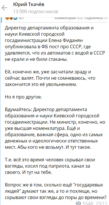"Директор департамента образования и науки Киевской городской госадминистрации Елена Фиданян опубликовала в ФБ пост про СССР, где удивляется, что из автоматов с водой в СССР не крали и не били стаканы.